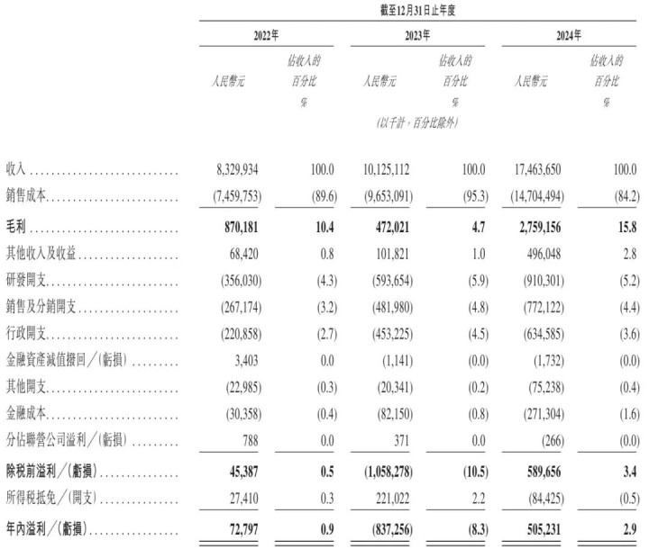 招股书显示,江波龙电子2022年、2023年、2024年营收分别为83.3亿元、101.25亿元、174.6亿元;毛利分别为8.7亿元、4.72亿元、27.59亿元;毛利率分别为10.4%、4.7%、15.8%。