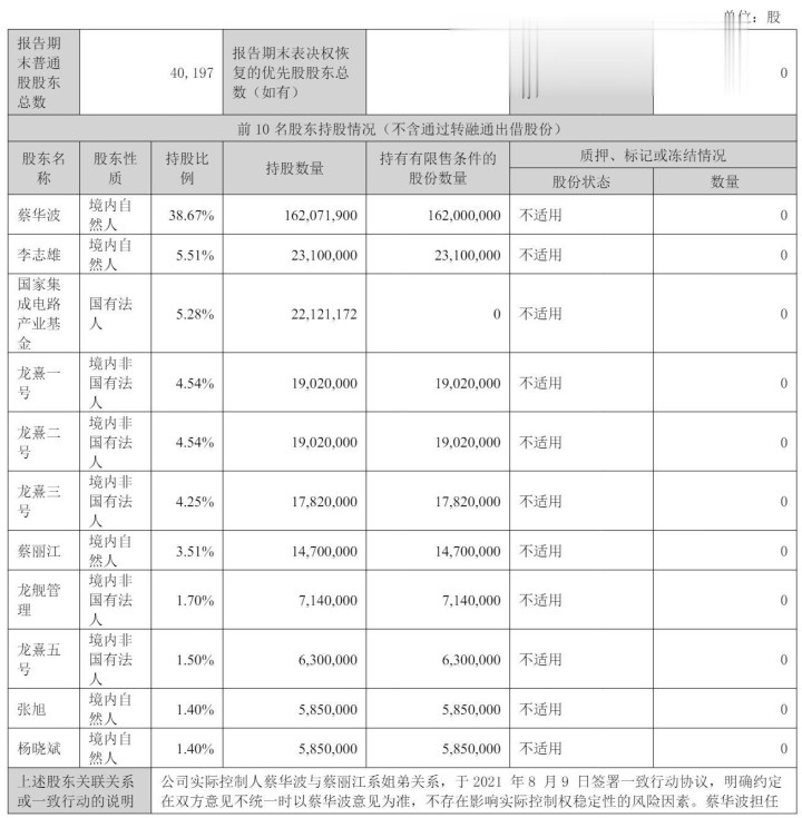 IPO前,蔡华波直接持股38.67%,李志雄持股为5.51%,国家集成电路产业基金持股为5.28%,龙熹一号、龙熹二号分别持股为4.54%,龙熹三号持股为4.25%,蔡丽江女士直接持股3.51%,龙舰管理持股为1.7%,龙熹五号持股为1.5%,张旭、杨晓斌分别持股为1.4%。